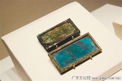 蓝色玻璃牌饰由长方形铜框镶嵌一块浅蓝色透明平板玻璃构成。墓中共出土这类玻璃牌饰11对22件。这是迄今为止年代最早的中国平板玻璃,十分珍贵,对研究中国古代玻璃生产具有极其重要的意义。