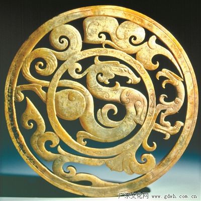 透雕龙凤纹重环玉佩青白玉雕成,直径10.6厘米,厚0.5厘米。这件玉佩雕镂精细,构图完美和谐,主次分明,是汉玉中不可多得的艺术珍品,它的器形图案被选为西汉南越王博物馆的馆徽。