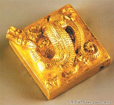 它是南越文王的官印。印钮是一条游龙,盘曲成“S”形,龙首伸向一角,龙鳞和爪是铸后凿刻的,龙腰隆起以系印绶。经电子探针测定,黄金含量超过98%。