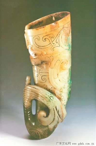 角形玉杯用一整块青玉雕琢而成,玉杯应是酒器,呈犀牛角造型。这件玉器,既是一件美轮美奂的工艺品,又是一件融传说于现实、引人遐思的实用品,堪称中国汉玉中不可多得的稀世之宝。