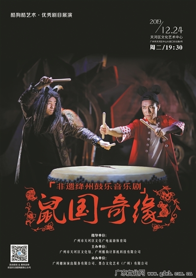 12月24日晚,中国首部原创鼓乐音乐剧《鼠国奇缘》(上图为海报)将在天河区文化艺术中心上演。据悉,这是酷狗酷艺术·优秀剧目展演之一。该剧以绛州鼓乐与现代音乐剧融合创新为突破口,对于绛州鼓乐这一“非遗”的传承和传播具有积极意义。