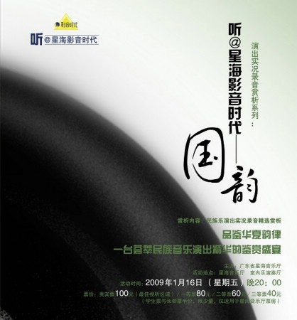 09年1月16日晚,新一年的“星海影音时代”演出实况音像赏析活动将于星海音乐厅室内乐厅拉开序幕。首场视听活动“国韵”,将烹饪一道最具中国特色的音乐佳肴,活动中荟萃了音乐厅十年来多位民乐名家、民乐团的演出精华。本场活动是广大民族乐爱好者的一次聚会,也是欣赏民乐起步者的最佳平台。